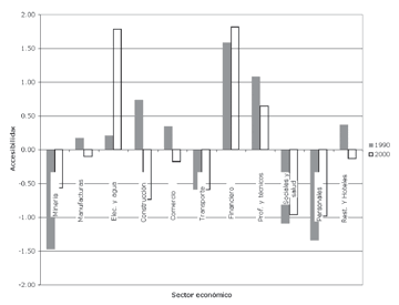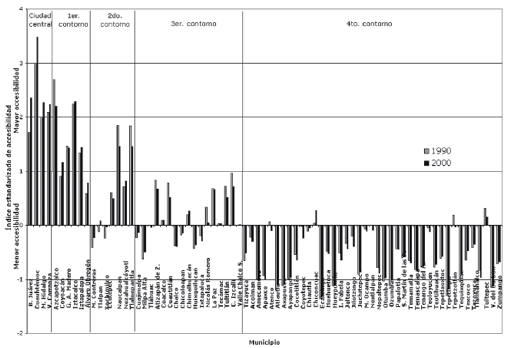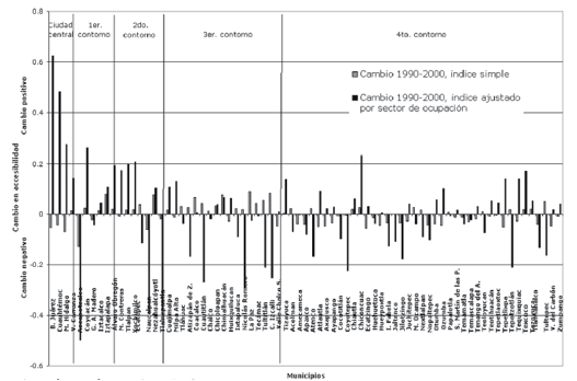 accesibilidad a empleos entre 1990 y 2000. La discusión se centra en determinar