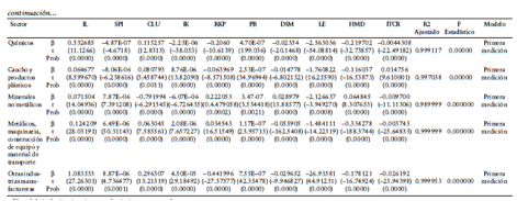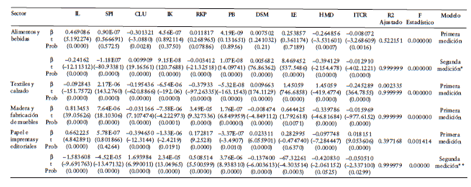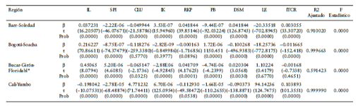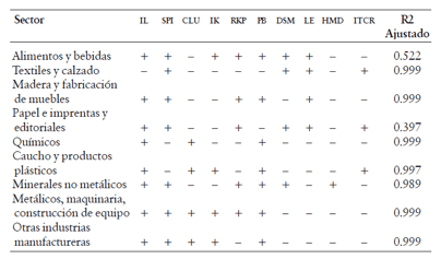 [30] Se consideran como unidades de sección cruzada la organización industrial: salario promedio industrial (spi), costo laboral unitario (clu), intensidad del capital (ik) y relación capital producto (rkp); variables geográficas: índice de localización (il), tamaño de la población (pb), tasa de desempleo (dsm) e índice de tasa de cambio real (itcr); y variables sociales: logro educativo (le), y tasa de homicidios (hmd)