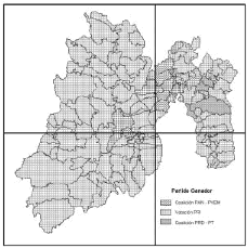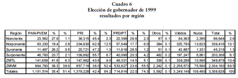 [7] Para la elección de gobernador de 1999 se tomaron como referentes los porcentajes de votos de la Coalición pan/pvem y de la Coalición prd/pt.