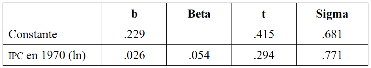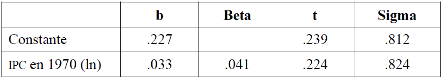 una regresión que se calculó para la diferencia en el ipc entre 1970 y 1980 como vd y el ipc en 1970