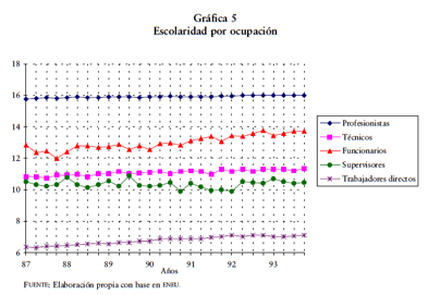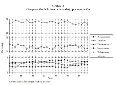 composición de la fuerza de trabajo por ocupación entre 1987 y 1993 medida por