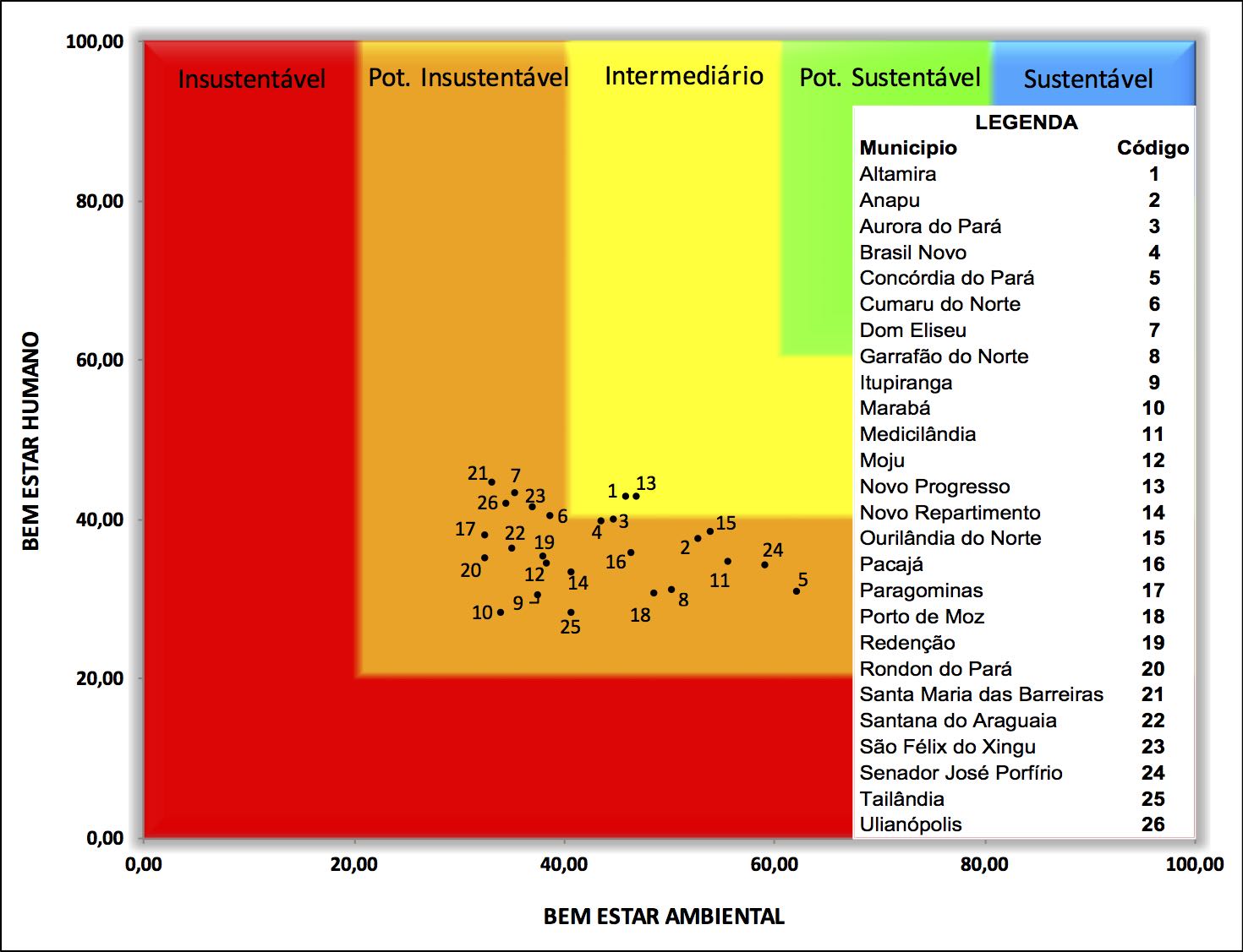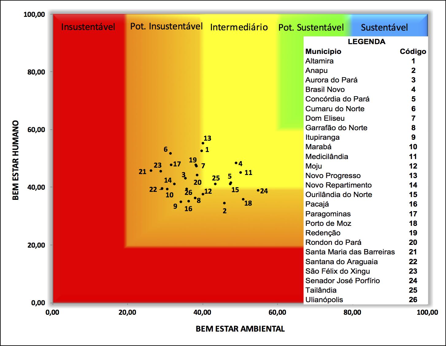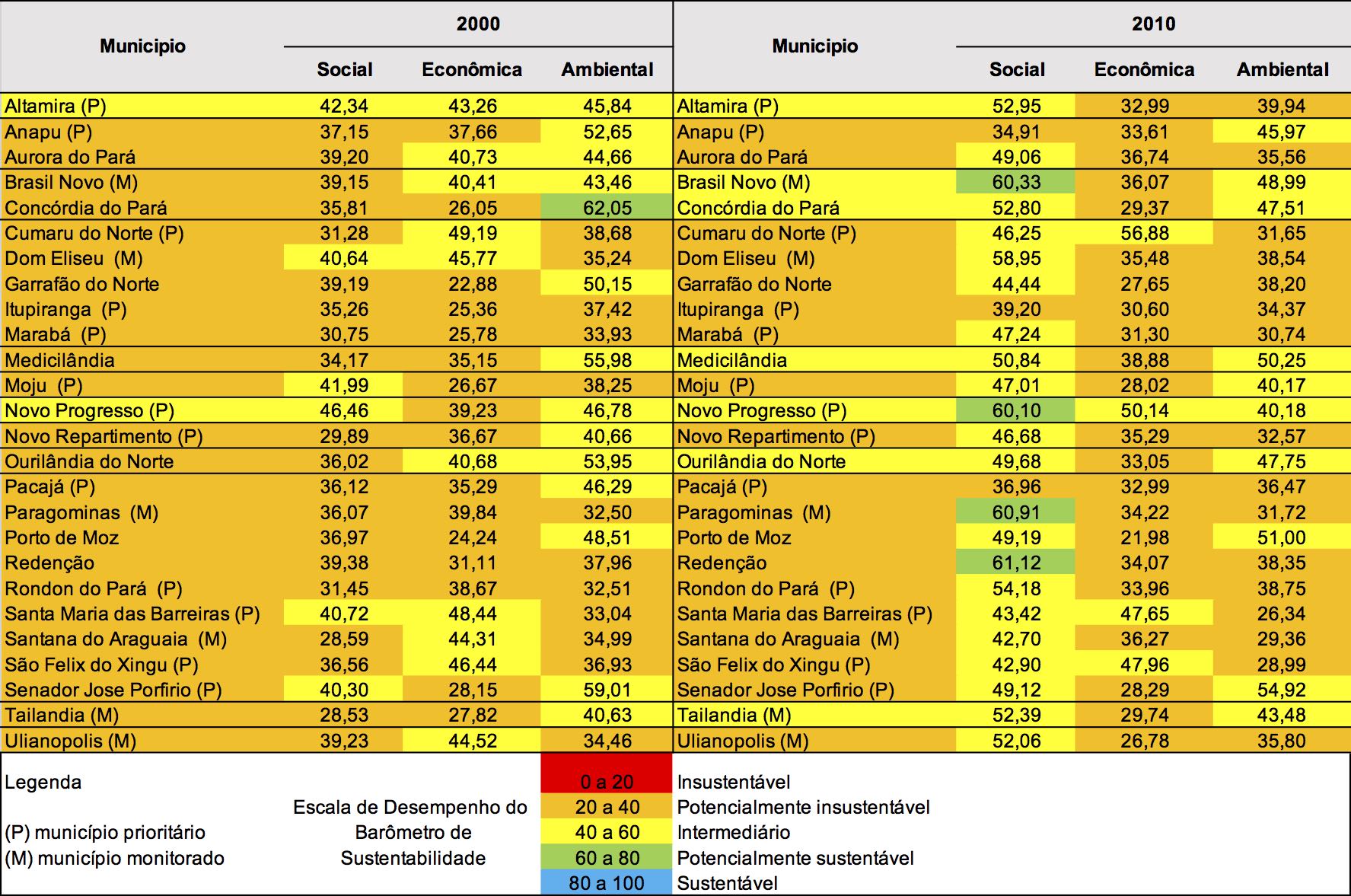 This work analyzed sustainability performance of 26 municipalities in the so-called amazon arch of deforestation in the state of Pará, Brazil in the years 2000 and 2010, using the Sustainability Barometer with 31 indicators in social, economic and environmental dimensions. The results show that Altamira and Novo Progresso have intermediate performance in two years and five municipalities progressed to the intermediate level in 2010 while the other remained in a critical situation. There was a slowdown in deforestation in municipalities, but despite the positive results achieved, they were unsatisfactory to change the sustainability status of municipalitiesCitas