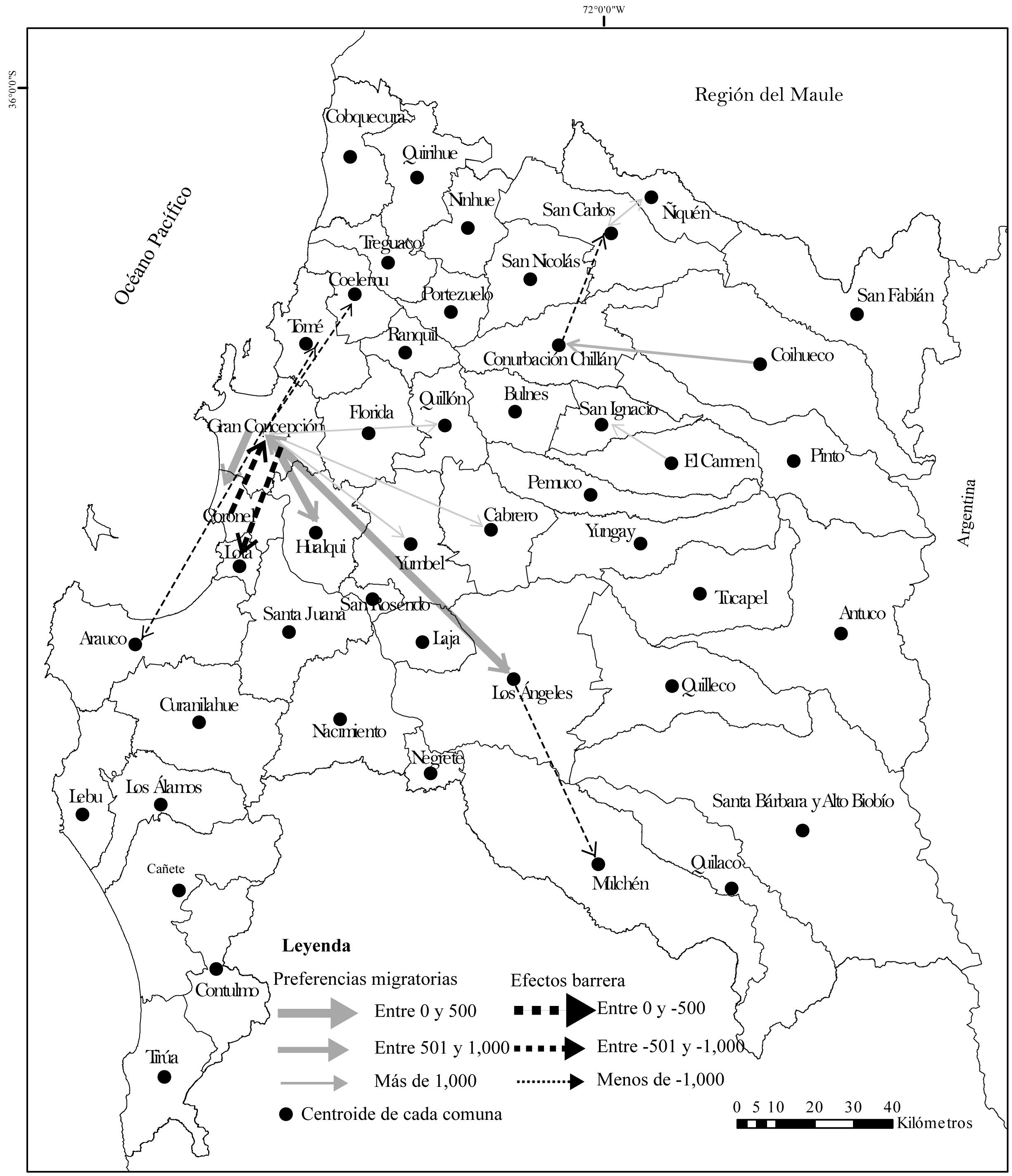 El proceso de migraciones internas en la región del Biobío expresa un proceso de redistribución espacial que tiende a la polarización del espacio hacia la capital regional –Concepción metropolitano– y a las comunas contiguas a ésta. De igual manera, se observa una fuerte atracción migratoria de las capitales provinciales pero circunscrita a su hinterland. Además, se determina que el perfil del migrante desde estas ciudades hacia la capital regional se caracterizaría por una alta educación, a diferencia de los migrantes de las comunas aledañas a las capitales provinciales, que se compondrían más bien por población joven con bajos grados de escolaridad.